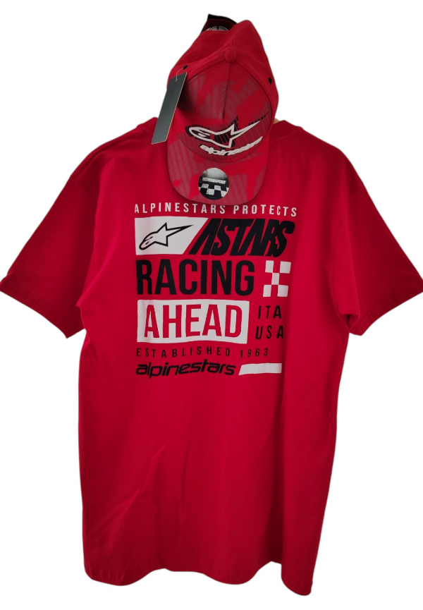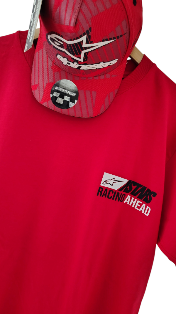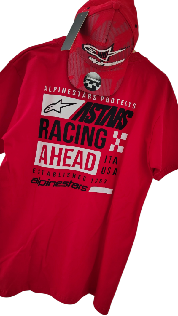Llevate la remera Alpinestars Racing Ahead 100% algodón, con doble estampado de alta definición al frente y en la espalda, + la cap Alpinestars roja, el clásico que completa cualquier outfit.